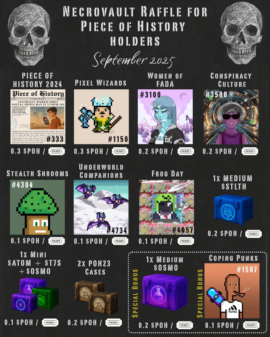 By soft staking their POH24 NFTs on Necrovault, holders earn our native token, $POH, which grants access to monthly raffle events where exclusive rewards are distributed to the community.