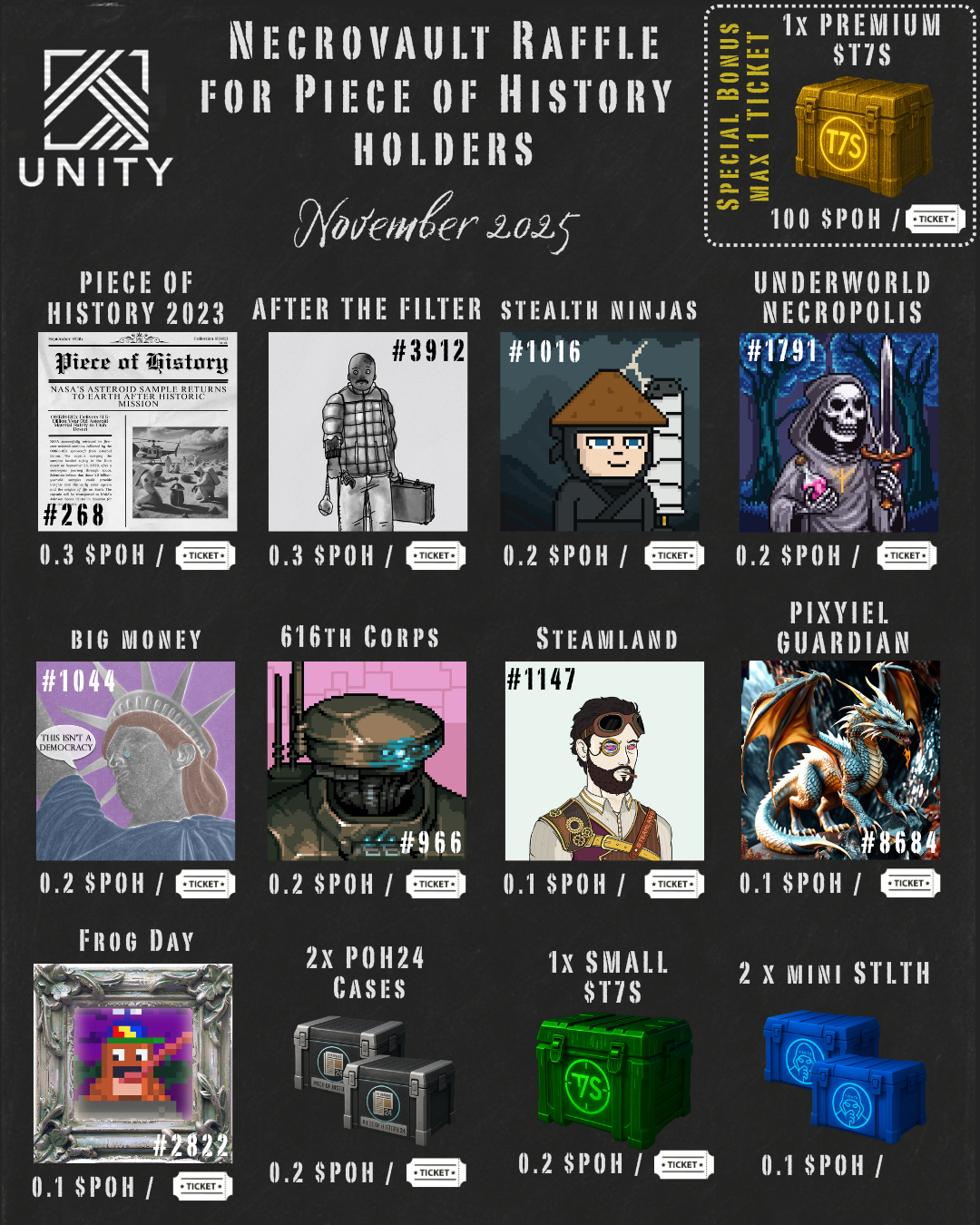 By soft staking their POH24 NFTs on Necrovault, holders earn our native token, $POH, which grants access to monthly raffle events where exclusive rewards are distributed to the community.